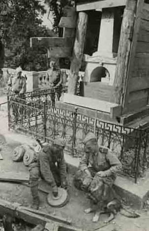 Александр Грибовский Сапёры разминируют могилу А.С. Пушкина у Святогорского монастыря (Пушкинские горы) Июль 1944 г. Фотобумага глянец, ручная Ч\Б печать. 162х116. Ф-1/Гри